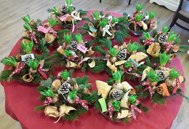 Cette activité est un excellent moyen pour les résidents d'exprimer leur créativité. Chaque composition est unique puisqu'elle est le fruit de l'interprétation personnelle. La composition florale modèle est en lien avec le thème du mois ou des événements festifs. Les compositions resteront pour la durée des fêtes au centre des tables dans le restaurant. Une activité pour se faire plaisir et valoriser les résidents !