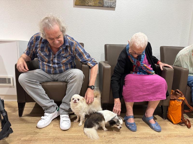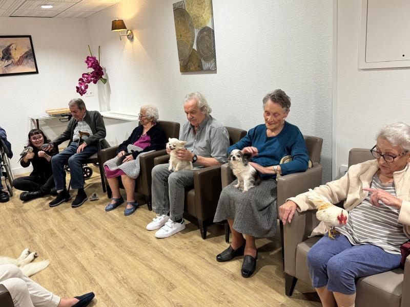 Ces temps de rencontre privilégiés permettent aux résidents de créer un lien apaisant et sécurisant avec les animaux, favorisant le bien-être, la détente et la stimulation émotionnelle et sensorielle.