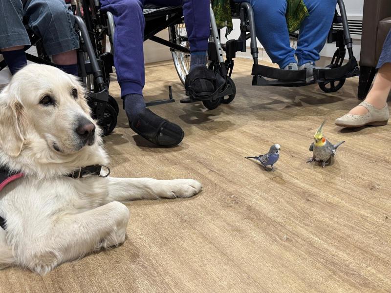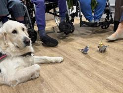 un golden retriever, deux chihuahuas, deux perruches, une tourterelle, un coq et un lapin. Leur présence invite à l’échange, au contact, à l’observation et au partage d’émotions positives.